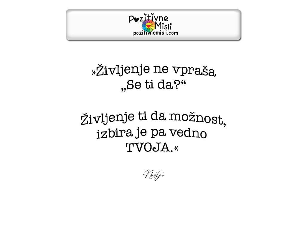 »Življenje ne vpraša „Se ti da?“ Življenje ti da možnost, izbira je pa vedno TVOJA.«