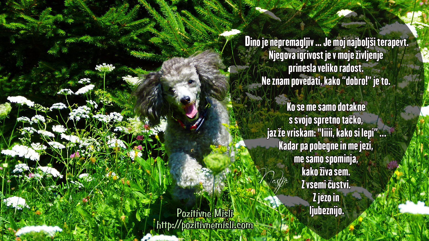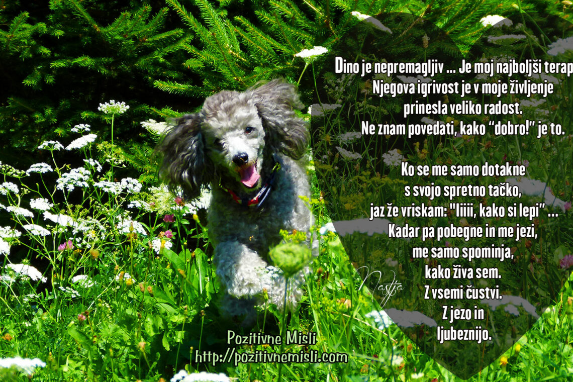 Dino je nepremagljiv … Je moj najboljši terapevt. Njegova igrivost je v moje življenje prinesla veliko radost. Ne znam povedati, kako dobro je to. Ko se me samo dotakne s svojo spretno tačko, jaz že vriskam:” Iiiiiii, kako si lep.”