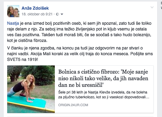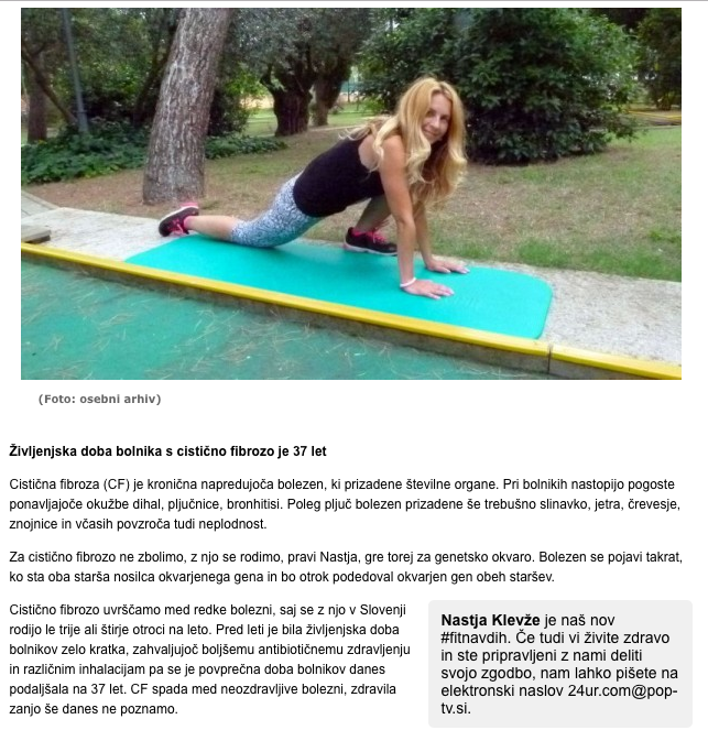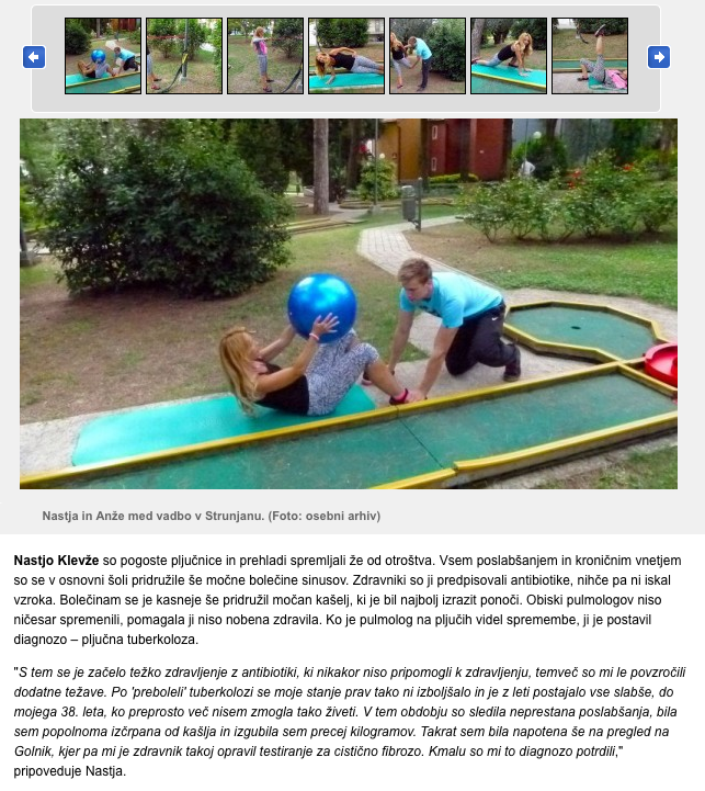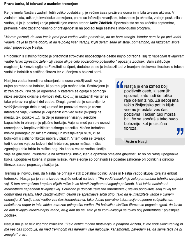 “Nastja je ena izmed bolj pozitivnih oseb, ki sem jih spoznal, zato tudi še toliko raje delam z njo. Za seboj ima težko življenjsko pot in kljub vsemu je ostala ves čas pozitivna. Takšen tudi moraš biti, če se soočaš s tako hudo boleznijo, kot je cistična fibroza. V članku je njena zgodba, na koncu pa tudi jaz odgovorim na par stvari o najini vadbi.”
