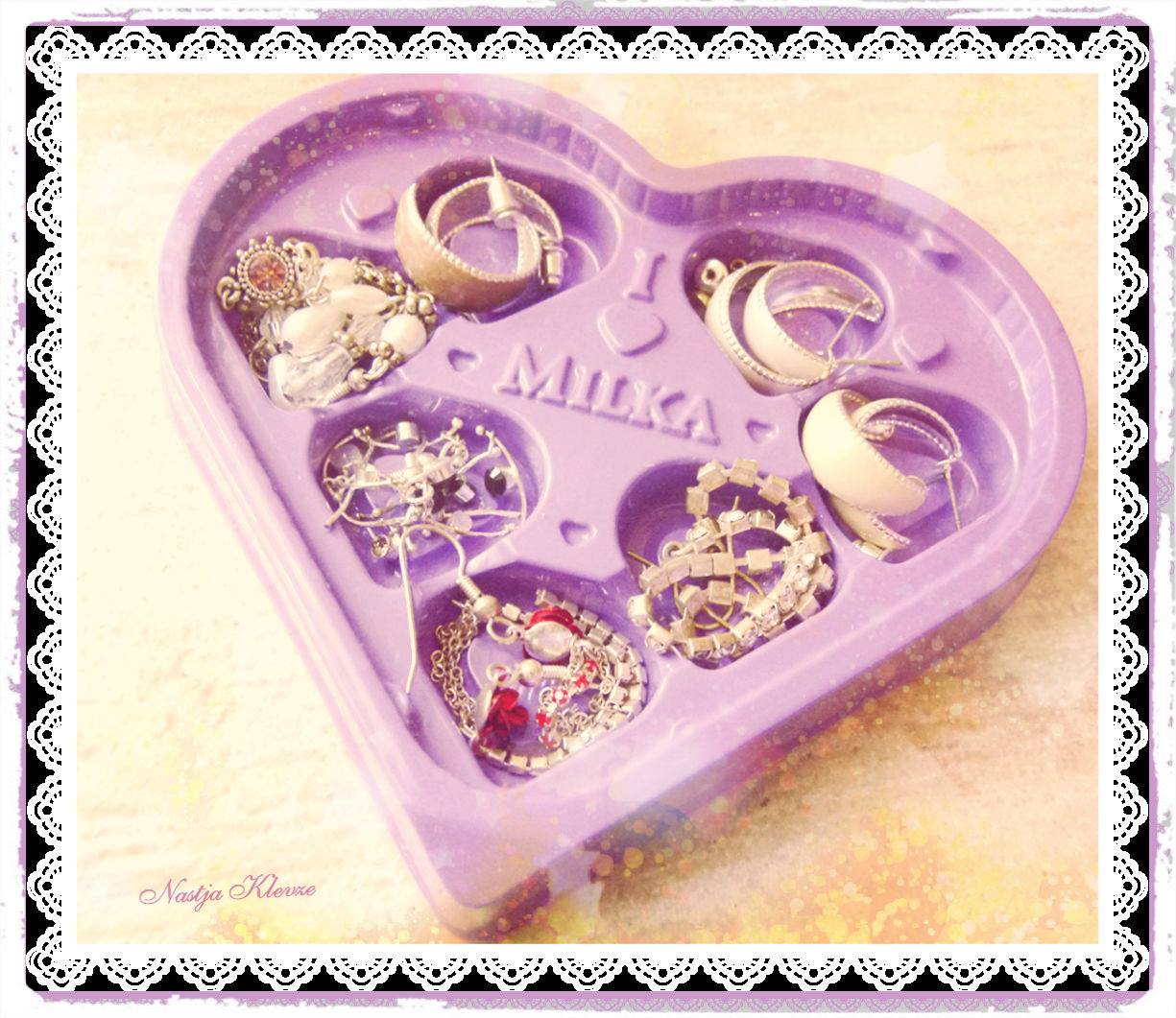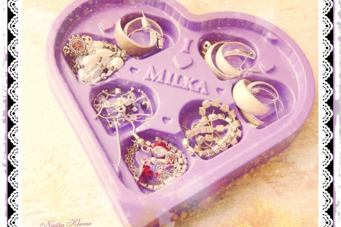 Za uhane in drugi nakit lahko sami uredimo šatulje. Tokrat sem svoje uhane zložila v škatlico Milkinih srčkov. Zdaj so moji uhani preglednejši in lepo zloženi.