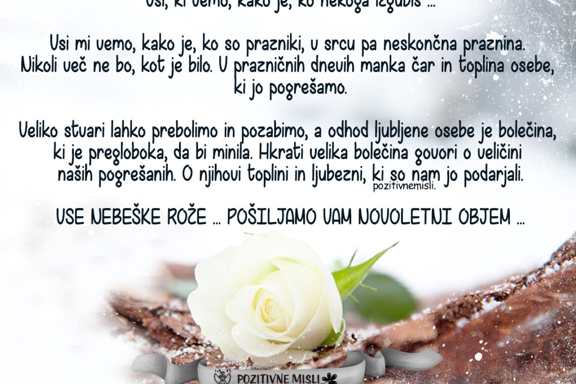 Vsi mi vemo, kako je, ko so prazniki, v srcu pa neskončna praznina. Nikoli več ne bo, kot je bilo. V prazničnih dnevih manka čar in toplina osebe, ki jo pogrešamo. Veliko stvari lahko prebolimo in pozabimo, a odhod ljubljene osebe je bolečina, ki je pregloboka, da bi minila. Hkrati velika bolečina govori o veličini naših pogrešanih. O njihovi toplini in ljubezni, ki so nam jo podarjali. Vse nebeške rože … pošiljamo vam novoletni objem …
